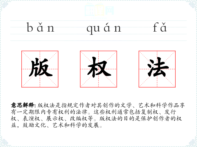 - 反义词:无(版权法本身是保护性的法律,没有直接的反义词)