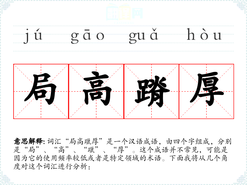 词汇“局高躐厚”是一个汉语成语,由四个字组成,分别是“局”、“高”、“躐”、“厚”。这个成语并不常见,可能是因为它的使用频率较低或者是特定领域的术语。下面我将从几个角度对这个词汇进行分析:
