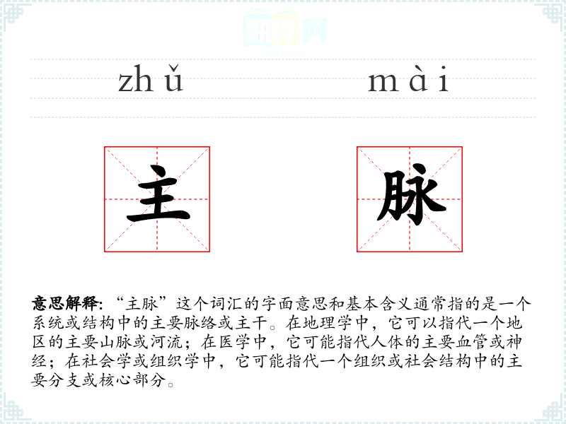 “主脉”这个词汇的词源可能来自于中医学中对脉络的描述,后来逐渐扩展到其他领域,如地理、组织结构等。在语言的发展过程中,它被赋予了更广泛的含义,用以描述各种系统中的主要部分。