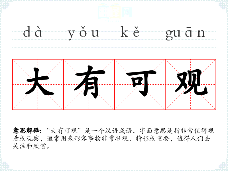 “大有可观”是一个汉语成语,字面意思是指非常值得观看或观察,通常用来形容事物非常壮观、精彩或重要,值得人们去关注和欣赏。