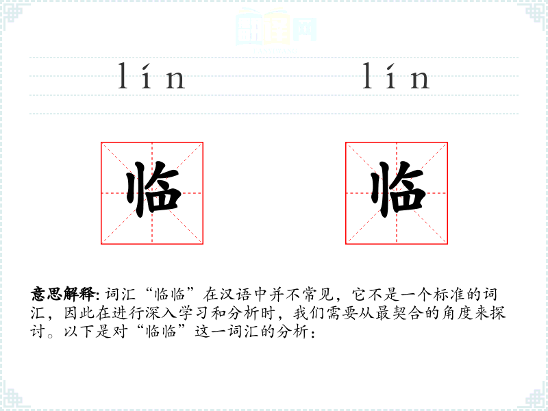 词汇“临临”在汉语中并不常见,它不是一个标准的词汇,因此在进行深入学*和分析时,我们需要从最契合的角度来探讨。以下是对“临临”这一词汇的分析: