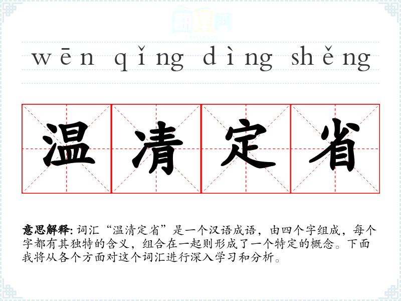 词汇“温清定省”是一个汉语成语,由四个字组成,每个字都有其独特的含义,组合在一起则形成了一个特定的概念。下面我将从各个方面对这个词汇进行深入学*和分析。