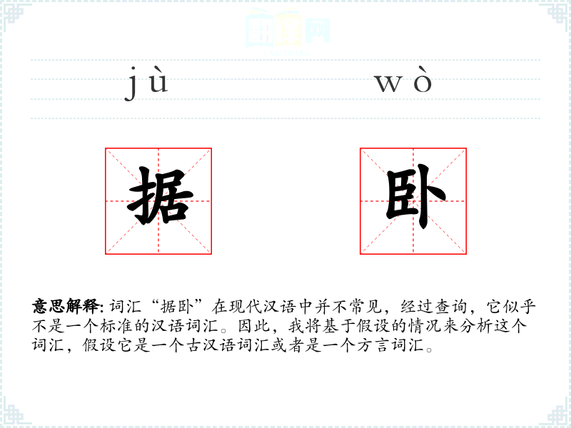 词汇“据卧”在现代汉语中并不常见,经过查询,它似乎不是一个标准的汉语词汇。因此,我将基于假设的情况来分析这个词汇,假设它是一个古汉语词汇或者是一个方言词汇。