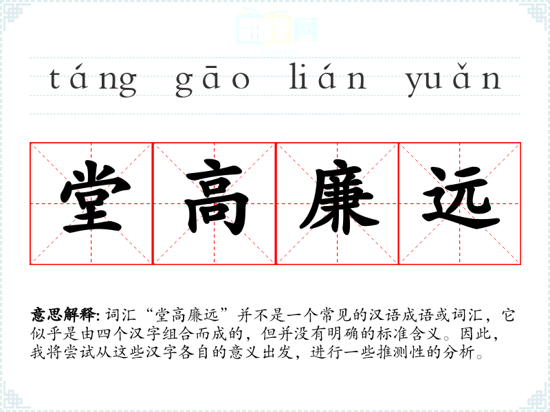 “堂高廉远”这个词汇虽然不常见,但通过对单个汉字的分析,我们可以推测它可能用来形容一种高尚、廉洁且有远见的品质。在语言学习和表达中,了解和掌握这样的词汇可以丰富我们的表达方式,但在实际使用时需要注意语境和创造性的解释。