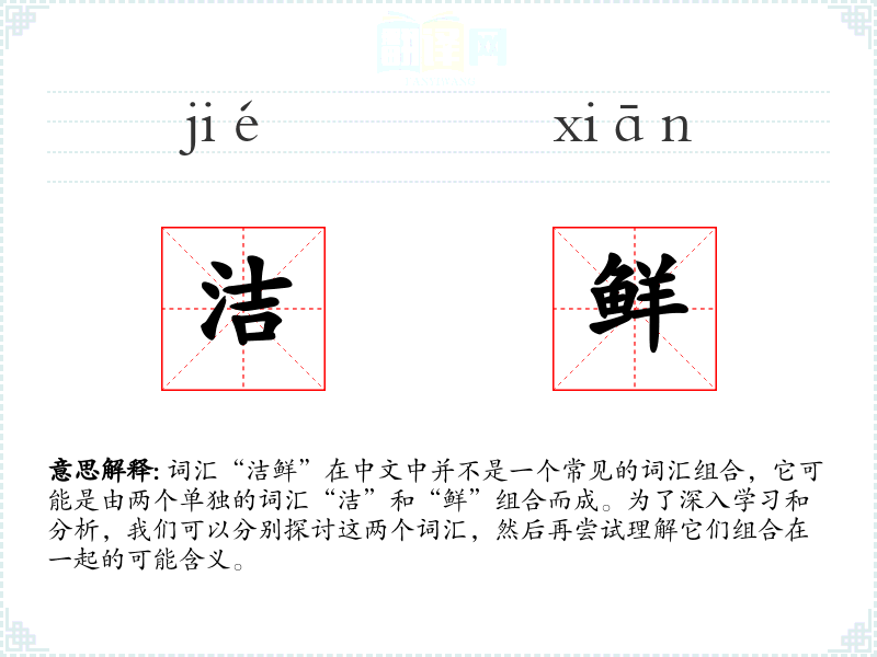 词汇“洁鲜”在中文中并不是一个常见的词汇组合,它可能是由两个单独的词汇“洁”和“鲜”组合而成。为了深入学*和分析,我们可以分别探讨这两个词汇,然后再尝试理解它们组合在一起的可能含义。