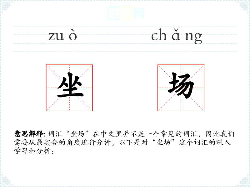 词汇“坐场”在中文里并不是一个常见的词汇,因此我们需要从最契合的角度进行分析。以下是对“坐场”这个词汇的深入学*和分析: