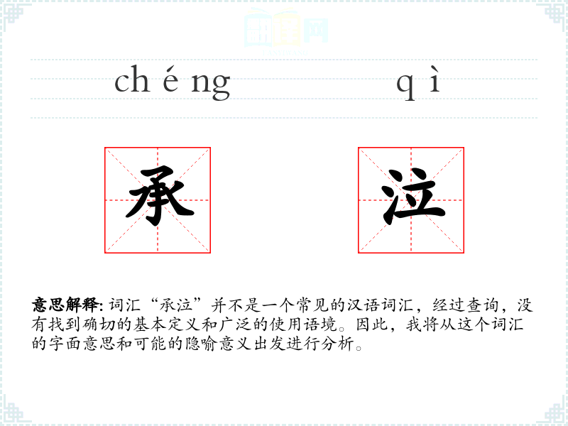 词汇“承泣”并不是一个常见的汉语词汇,经过查询,没有找到确切的基本定义和广泛的使用语境。因此,我将从这个词汇的字面意思和可能的隐喻意义出发进行分析。