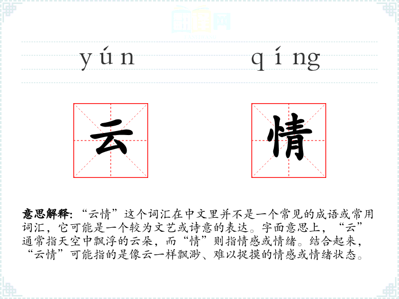 “云情”这个词汇虽然不常见,但它提供了一种诗意和文艺的表达方式,用以描述那些难以捉摸和变化的情感状态。在我的语言学*和表达中,它增加了我对情感描述的多样性和深度。