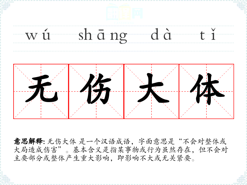 无伤大体 是一个汉语成语,字面意思是“不会对整体或大局造成伤害”。基本含义是指某事物或行为虽然存在,但不会对主要部分或整体产生重大影响,即影响不大或无关紧要。