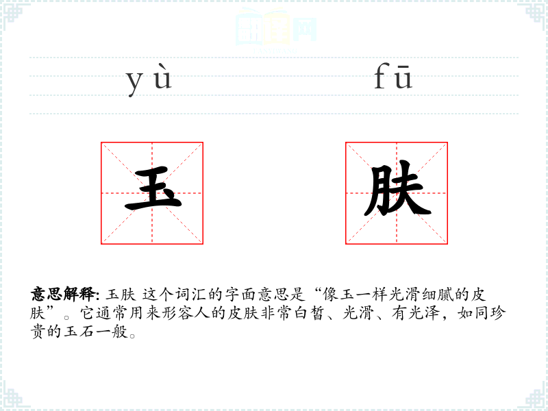 玉肤 这个词汇的字面意思是“像玉一样光滑细腻的皮肤”。它通常用来形容人的皮肤非常白皙、光滑、有光泽,如同珍贵的玉石一般。