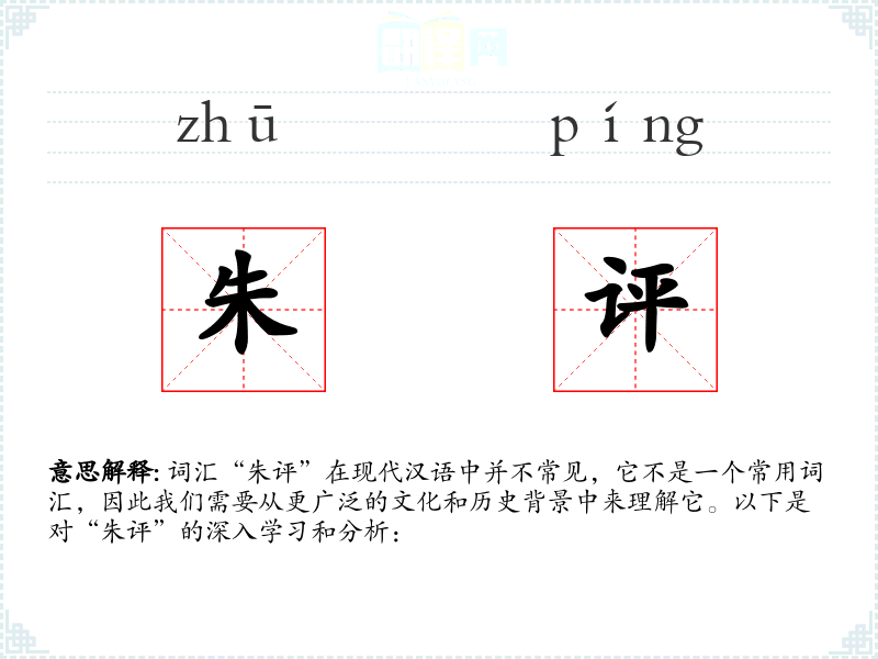 词汇“朱评”在现代汉语中并不常见,它不是一个常用词汇,因此我们需要从更广泛的文化和历史背景中来理解它。以下是对“朱评”的深入学*和分析: