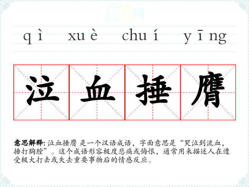 泣血捶膺 是一个汉语成语,字面意思是“哭泣到流血,捶打胸膛”。这个成语形容极度悲痛或悔恨,通常用来描述人在遭受极大打击或失去重要事物后的情感反应。