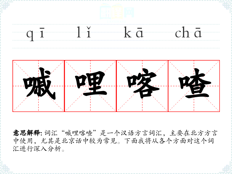 词汇“嘁哩喀喳”是一个汉语方言词汇,主要在北方方言中使用,尤其是北京话中较为常见。下面我将从各个方面对这个词汇进行深入分析。