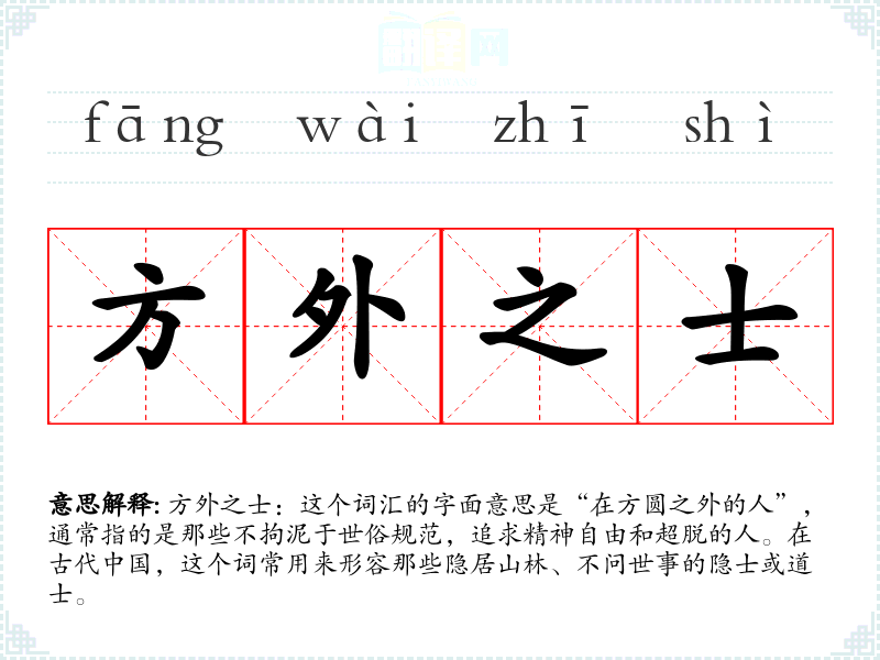 方外之士:这个词汇的字面意思是“在方圆之外的人”,通常指的是那些不拘泥于世俗规范,追求精神自由和超脱的人。在古代**,这个词常用来形容那些隐居山林、不问世事的隐士或道士。