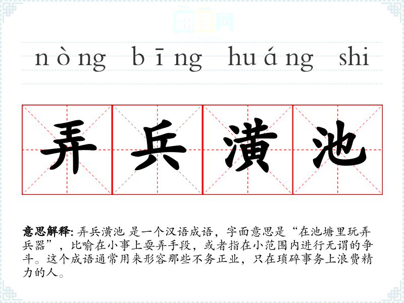 弄兵潢池 是一个汉语成语,字面意思是“在池塘里玩弄兵器”,比喻在小事上耍弄手段,或者指在小范围内进行无谓的争斗。这个成语通常用来形容那些不务正业,只在琐碎事务上浪费精力的人。