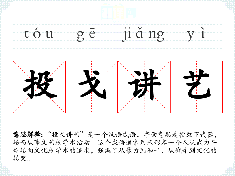 “投戈讲艺”是一个汉语成语,字面意思是指放下武器,转而从事文艺或学术活动。这个成语通常用来形容一个人从武力斗争转向文化或学术的追求,强调了从暴力到和平、从战争到文化的转变。