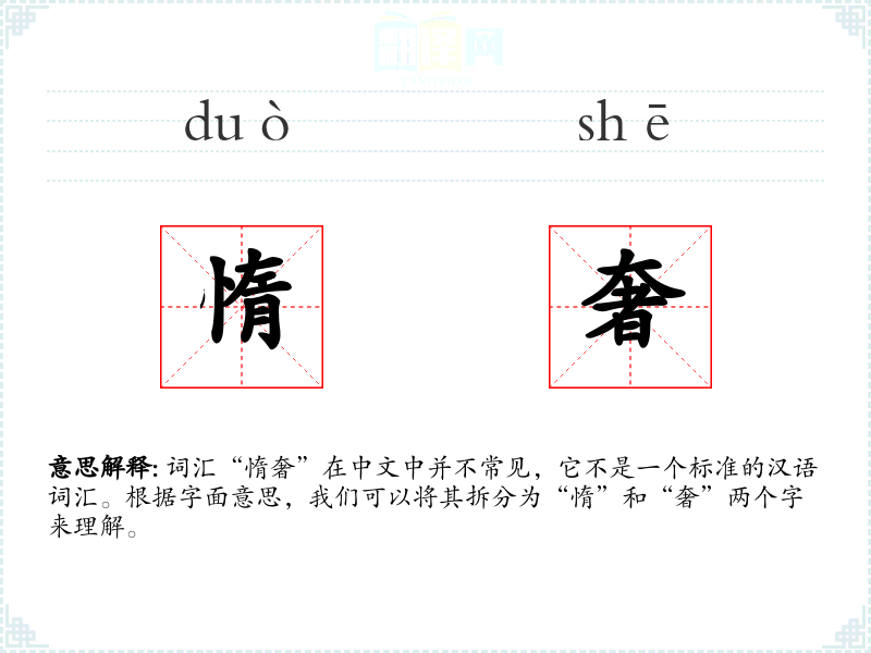 词汇“惰奢”在中文中并不常见,它不是一个标准的汉语词汇。根据字面意思,我们可以将其拆分为“惰”和“奢”两个字来理解。
