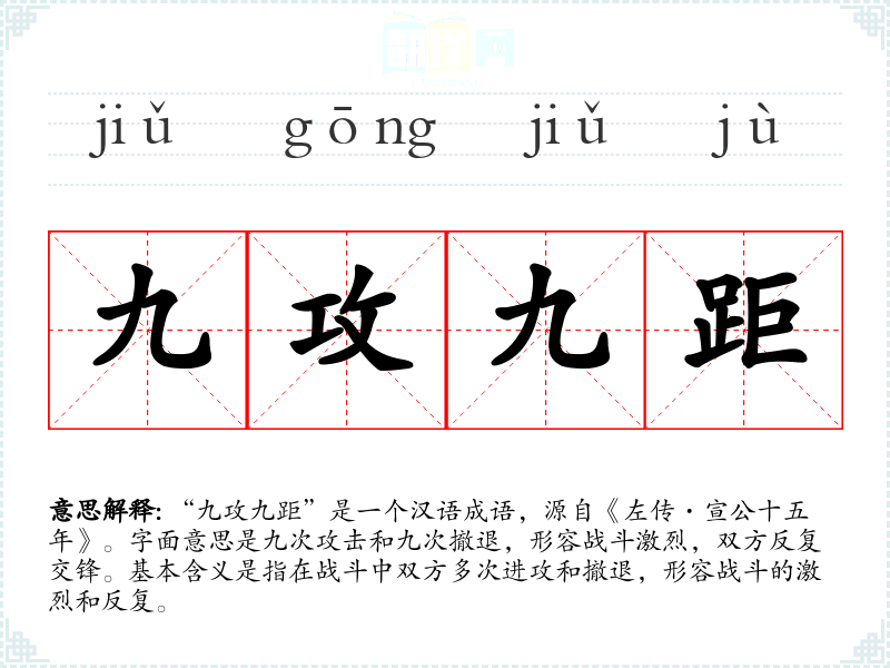 “九攻九距”是一个汉语成语,源自《左传·宣公十五年》。字面意思是九次攻击和九次撤退,形容战斗激烈,双方反复交锋。基本含义是指在战斗中双方多次进攻和撤退,形容战斗的激烈和反复。