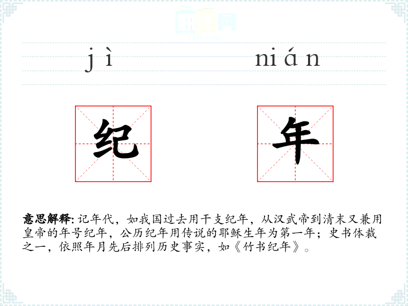 记年代,如我国过去用干支纪年,从汉武帝到清末又兼用皇帝的年号纪年,公历纪年用传说的耶稣生年为第一年;史书体裁之一,依照年月先后排列历史事实,如《竹书纪年》。