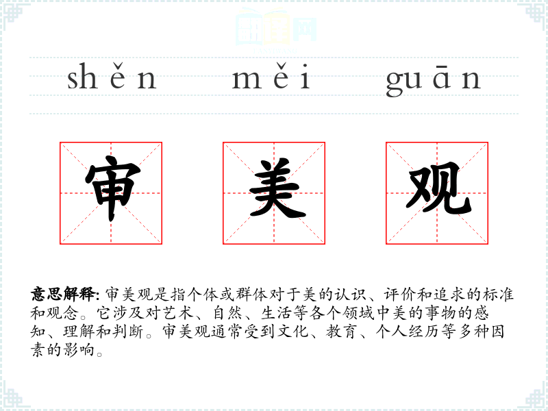 - 口语:在日常对话中,审美观可能表现为对某一事物的评价,如“我觉得这个设计不符合我的审美观。”