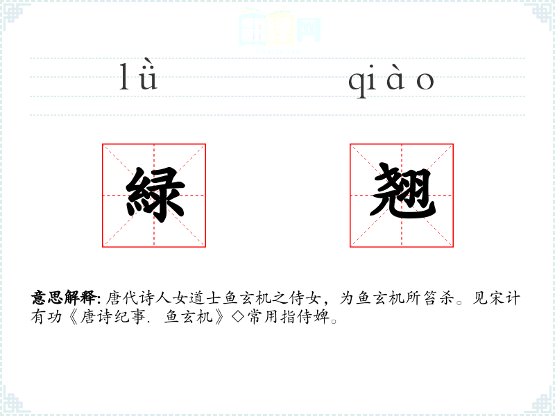 唐代诗人女道士鱼玄机之侍女,为鱼玄机所笞杀。见宋计有功《唐诗纪事.鱼玄机》◇常用指侍婢。