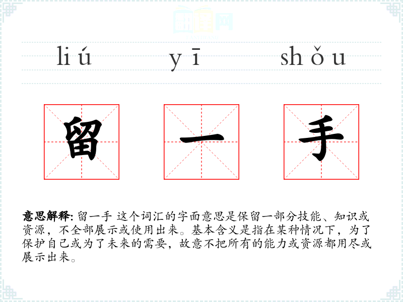留一手 这个词汇的字面意思是保留一部分技能、知识或资源,不全部展示或使用出来。基本含义是指在某种情况下,为了保护自己或为了未来的需要,故意不把所有的能力或资源都用尽或展示出来。