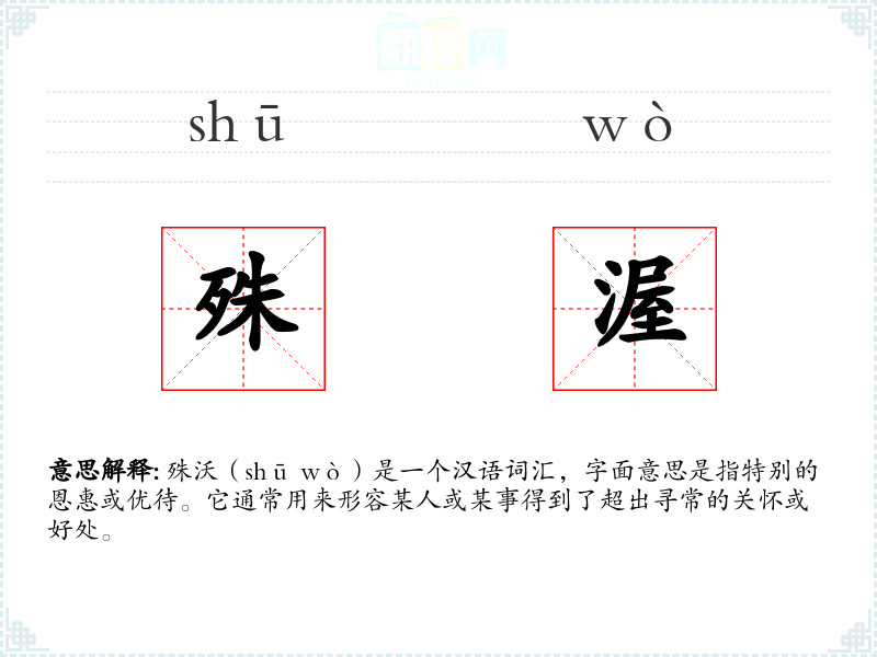 殊沃(shū wò)是一个汉语词汇,字面意思是指特别的恩惠或优待。它通常用来形容某人或某事得到了超出寻常的关怀或好处。