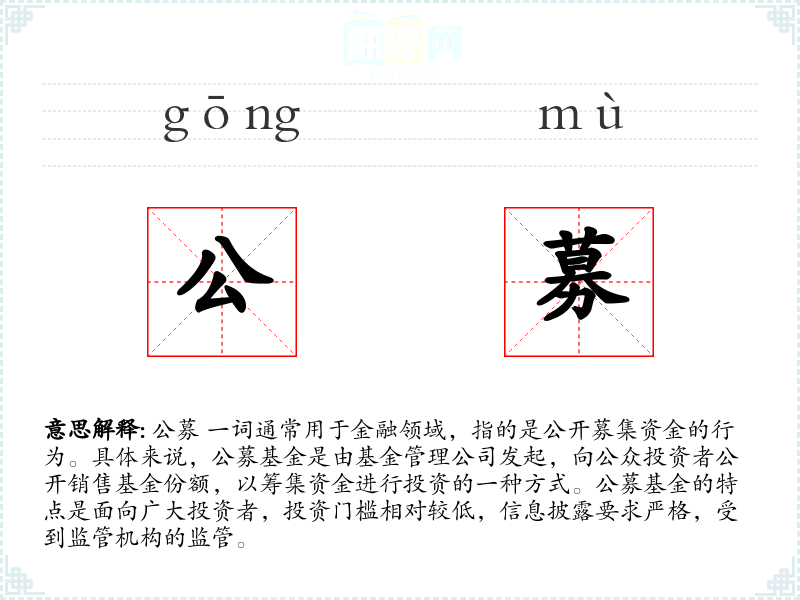 - 专业领域:在金融、投资领域,公募是一个常用词汇,用于描述基金的发行方式和运作机制。