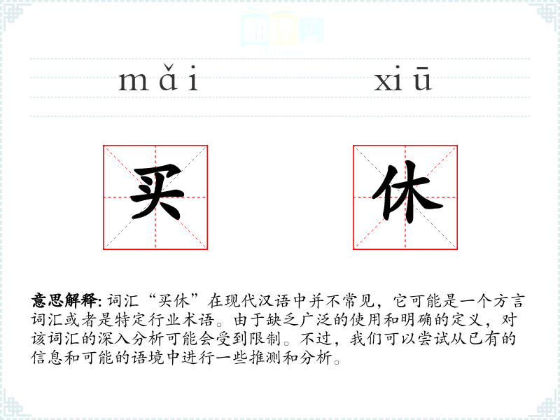 词汇“买休”在现代汉语中并不常见,它可能是一个方言词汇或者是特定行业术语。由于缺乏广泛的使用和明确的定义,对该词汇的深入分析可能会受到限制。不过,我们可以尝试从已有的信息和可能的语境中进行一些推测和分析。