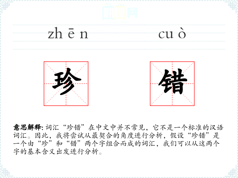 词汇“珍错”在中文中并不常见,它不是一个标准的汉语词汇。因此,我将尝试从最契合的角度进行分析,假设“珍错”是一个由“珍”和“错”两个字组合而成的词汇,我们可以从这两个字的基本含义出发进行分析。