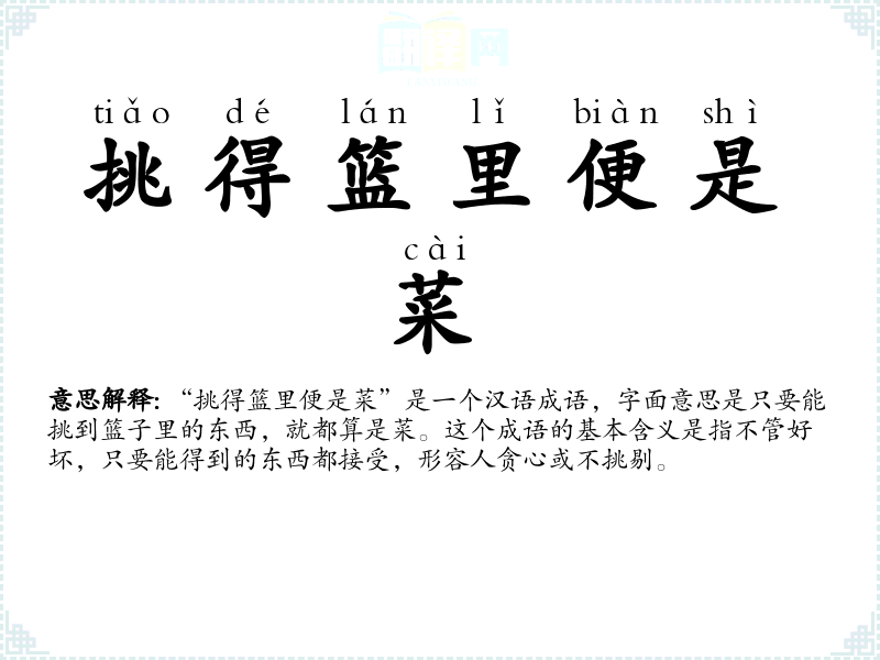 “挑得篮里便是菜”是一个汉语成语,字面意思是只要能挑到篮子里的东西,就都算是菜。这个成语的基本含义是指不管好坏,只要能得到的东西都接受,形容人贪心或不挑剔。