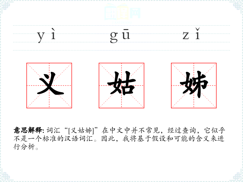 词汇“[义姑姊]”在中文中并不常见,经过查询,它似乎不是一个标准的汉语词汇。因此,我将基于假设和可能的含义来进行分析。