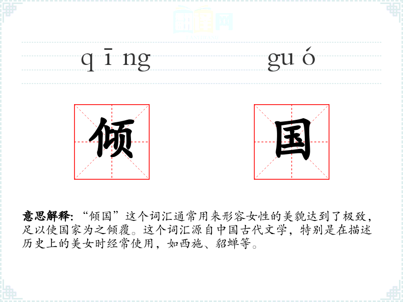 “倾国”这个词汇通常用来形容女性的美貌达到了极致,足以使国家为之倾覆。这个词汇源自**古代文学,特别是在描述历史上的美女时经常使用,如西施、貂蝉等。