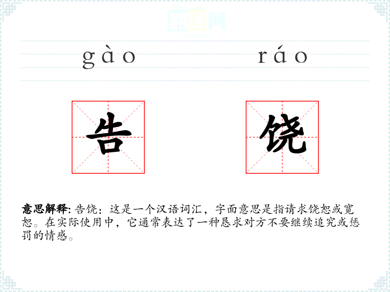 告饶:这是一个汉语词汇,字面意思是指请求饶恕或宽恕。在实际使用中,它通常表达了一种恳求对方不要继续追究或惩罚的情感。