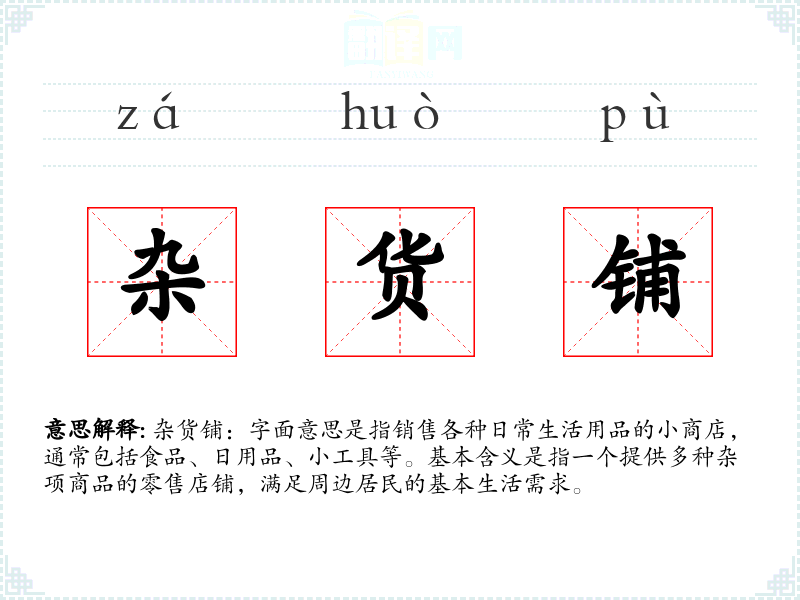 杂货铺:字面意思是指销售各种日常生活用品的小商店,通常包括食品、日用品、小工具等。基本含义是指一个提供多种杂项商品的零售店铺,满足周边居民的基本生活需求。