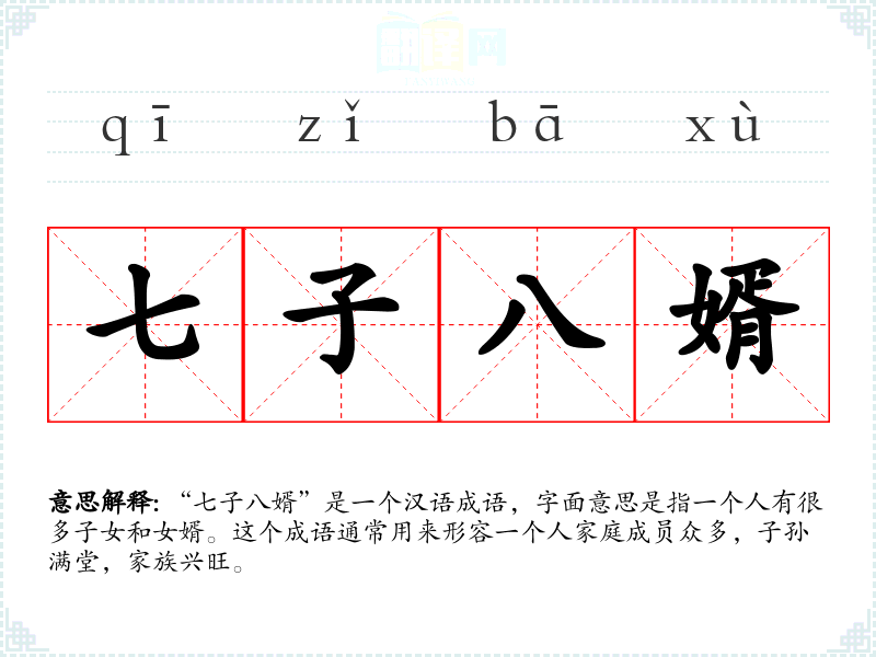 “七子八婿”是一个汉语成语,字面意思是指一个人有很多子女和女婿。这个成语通常用来形容一个人家庭成员众多,子孙满堂,家族兴旺。