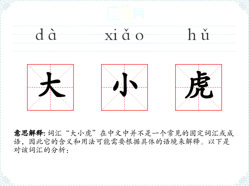 词汇“大小虎”在中文中并不是一个常见的固定词汇或成语,因此它的含义和用法可能需要根据具体的语境来解释。以下是对该词汇的分析: