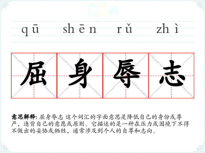 屈身辱志 这个词汇的字面意思是降低自己的身份或尊严,违背自己的意愿或原则。它描述的是一种在压力或困境下不得不做出的妥协或牺牲,通常涉及到个人的自尊和志向。