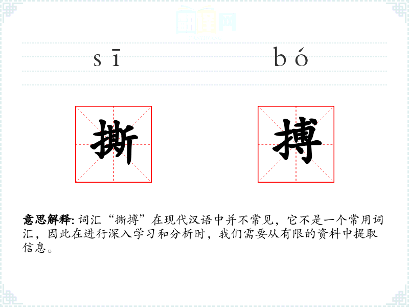 词汇“撕搏”在现代汉语中并不常见,它不是一个常用词汇,因此在进行深入学*和分析时,我们需要从有限的资料中提取信息。