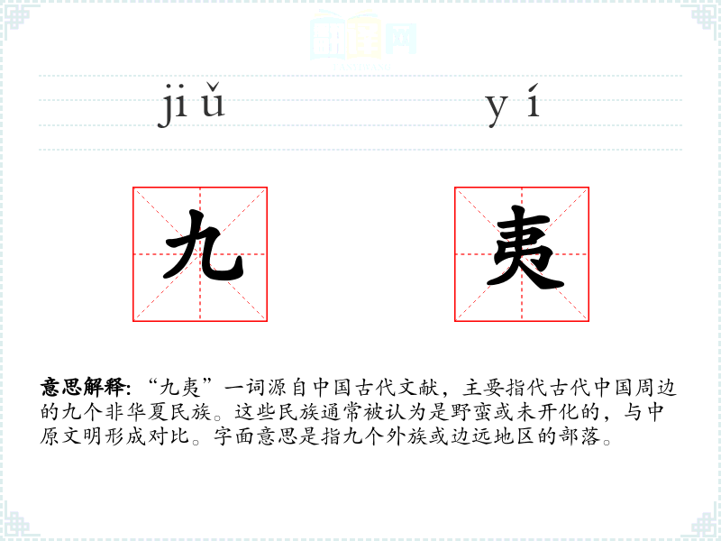 “九夷”一词源自古代文献,主要指代古代周边的九个非华夏民族。这些民族通常被认为是野蛮或未开化的,与中原文明形成对比。字面意思是指九个外族或边远地区的部落。