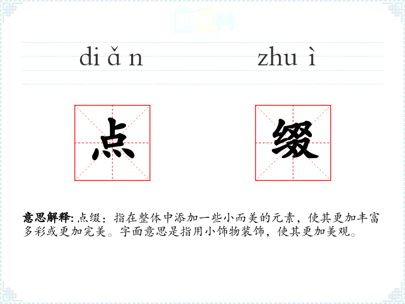 点缀:指在整体中添加一些小而美的元素,使其更加丰富多彩或更加完美。字面意思是指用小饰物装饰,使其更加美观。