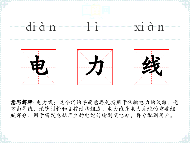 电力线:这个词的字面意思是指用于传输电力的线路,通常由导线、绝缘材料和支撑结构组成。电力线是电力系统的重要组成部分,用于将发电站产生的电能传输到变电站,再分配到用户。
