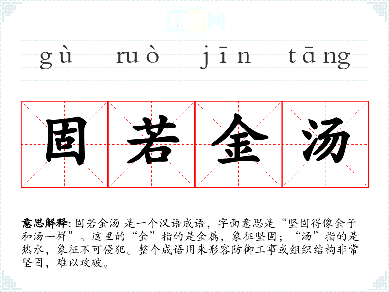 固若金汤 是一个汉语成语,字面意思是“坚固得像金子和汤一样”。这里的“金”指的是金属,象征坚固;“汤”指的是热水,象征不可侵犯。整个成语用来形容防御工事或组织结构非常坚固,难以攻破。