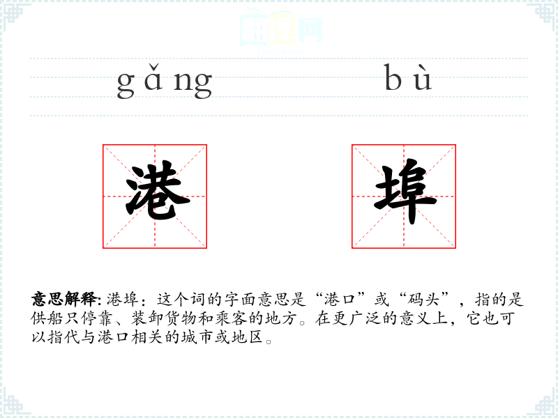 港埠:这个词的字面意思是“港口”或“码头”,指的是供船只停靠、装卸货物和乘客的地方。在更广泛的意义上,它也可以指代与港口相关的城市或地区。