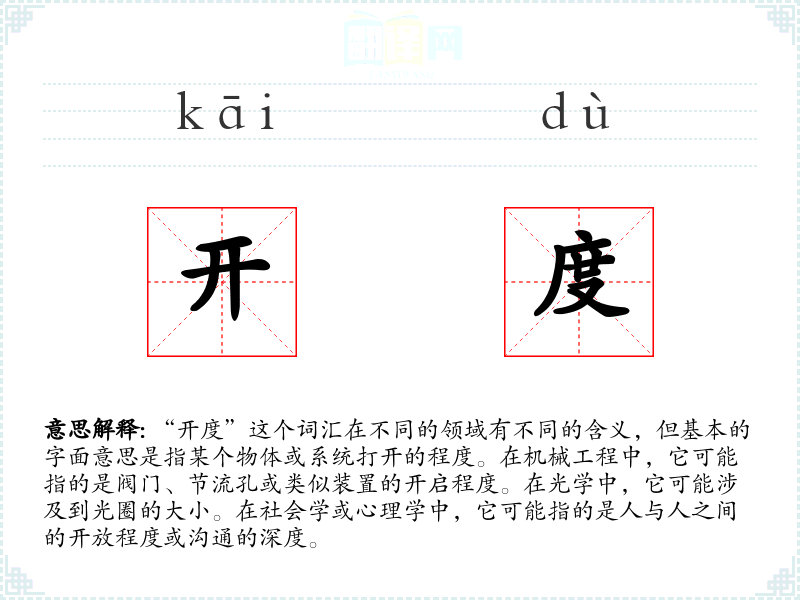 “开度”这个词汇在中文中直接来源于对“开”和“度”两个字的组合。在古代汉语中,“开”有打开、开启的意思,“度”则有程度、度量的含义。随着时间的推移,这个词汇在不同的专业领域中得到了具体化和深化。