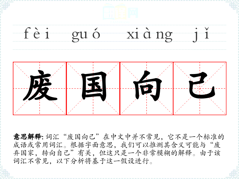 词汇“废国向己”在中文中并不常见,它不是一个标准的成语或常用词汇。根据字面意思,我们可以推测其含义可能与“废弃国家,转向自己”有关,但这只是一个非常模糊的解释。由于该词汇不常见,以下分析将基于这一假设进行。