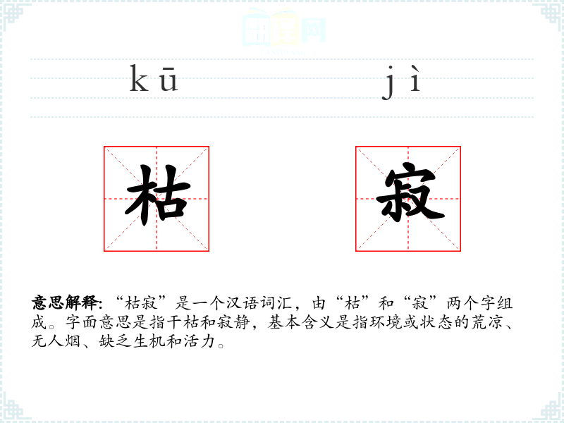 “枯寂”是一个汉语词汇,由“枯”和“寂”两个字组成。字面意思是指干枯和寂静,基本含义是指环境或状态的荒凉、无人烟、缺乏生机和活力。