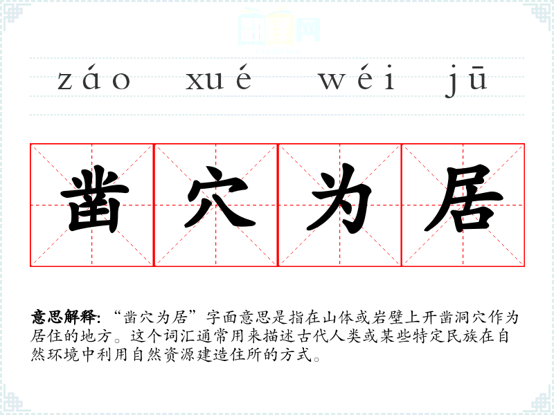 “凿穴为居”字面意思是指在山体或岩壁上开凿洞穴作为居住的地方。这个词汇通常用来描述古代人类或某些特定民族在自然环境中利用自然资源建造住所的方式。