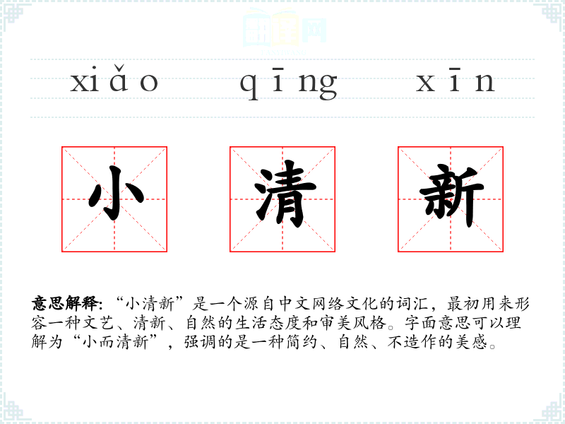 “小清新”是一个源自中文网络文化的词汇,最初用来形容一种文艺、清新、自然的生活态度和审美风格。字面意思可以理解为“小而清新”,强调的是一种简约、自然、不造作的美感。