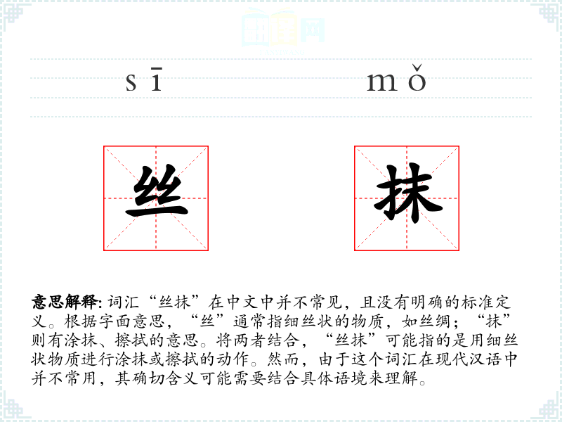 由于“丝抹”不是一个常用词汇,对其的理解和应用非常有限。在语言学习和表达中,这个词可能不是一个重要的词汇,但如果出现在某个特定的语境中,可能需要具体的研究来理解其含义和影响。总的来说,对于不常见的词汇,理解其具体含义和使用情况需要结合具体语境和背景知识。